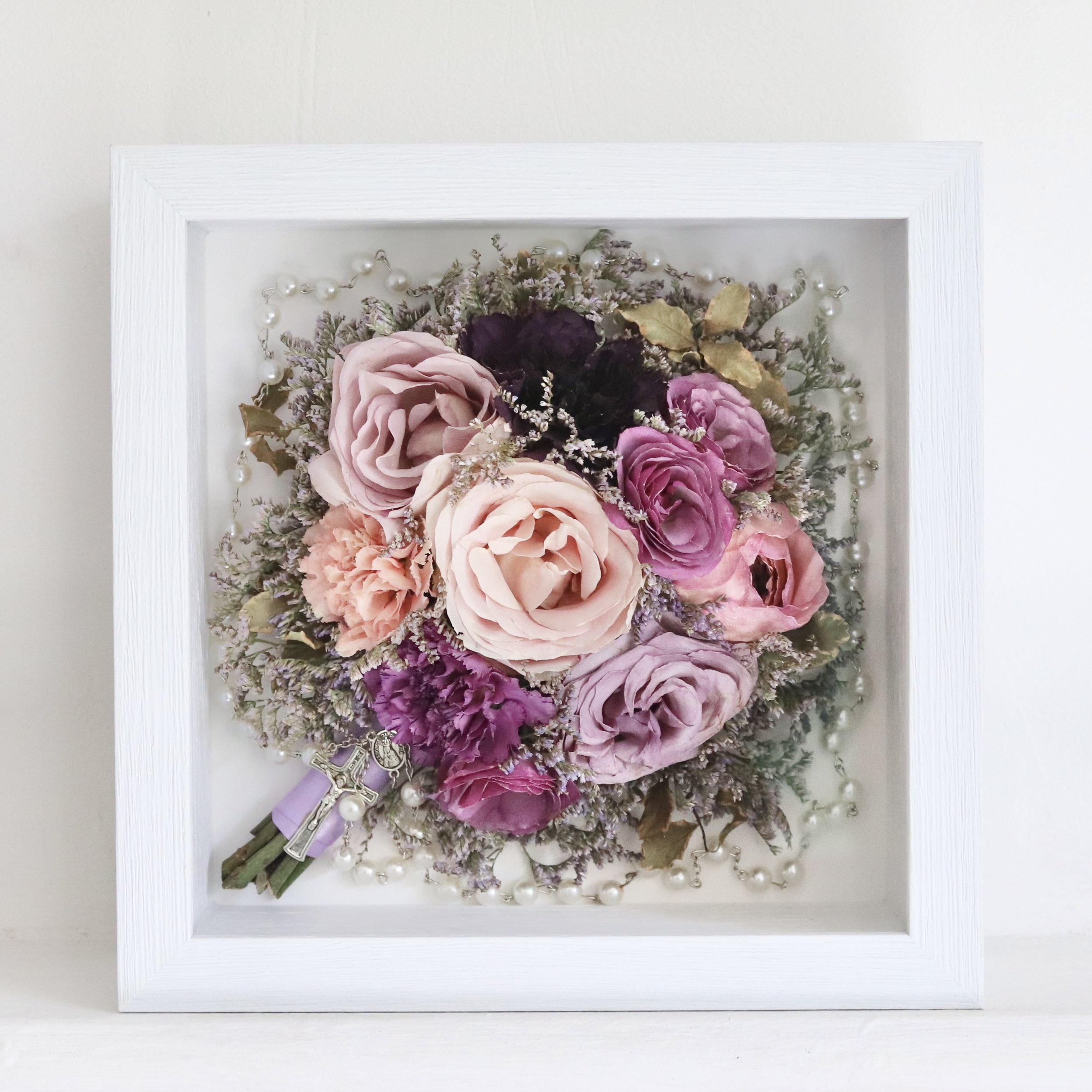 Je peux conserver les bouquets de fleurs séchées dans la résine, mais pas les fleurs qui ont été stabilisées avec de la glycérine ou une méthode similaire. Si votre bouquet contien des fleurs stabilisées, optez pour un cadre profond.