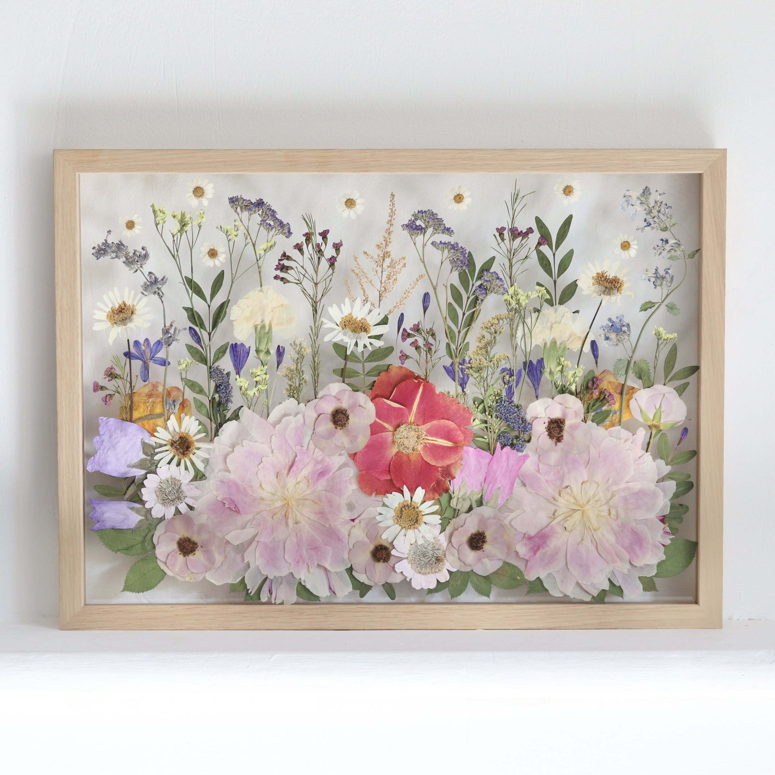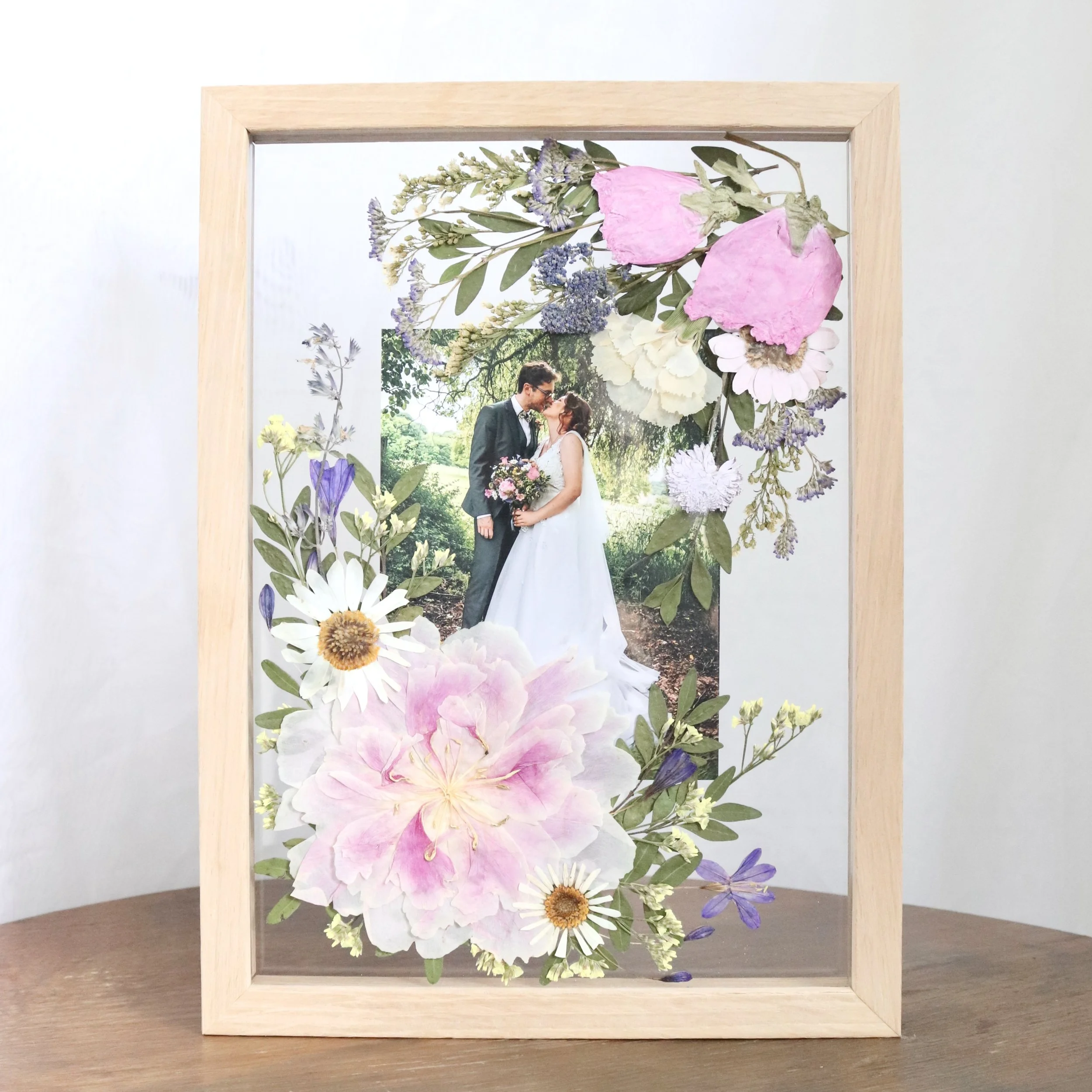 - classique : les fleurs sont également collées sur un contrecollé coloré (grand choix de couleurs) et insérées et scellées avec un fond en mousse.