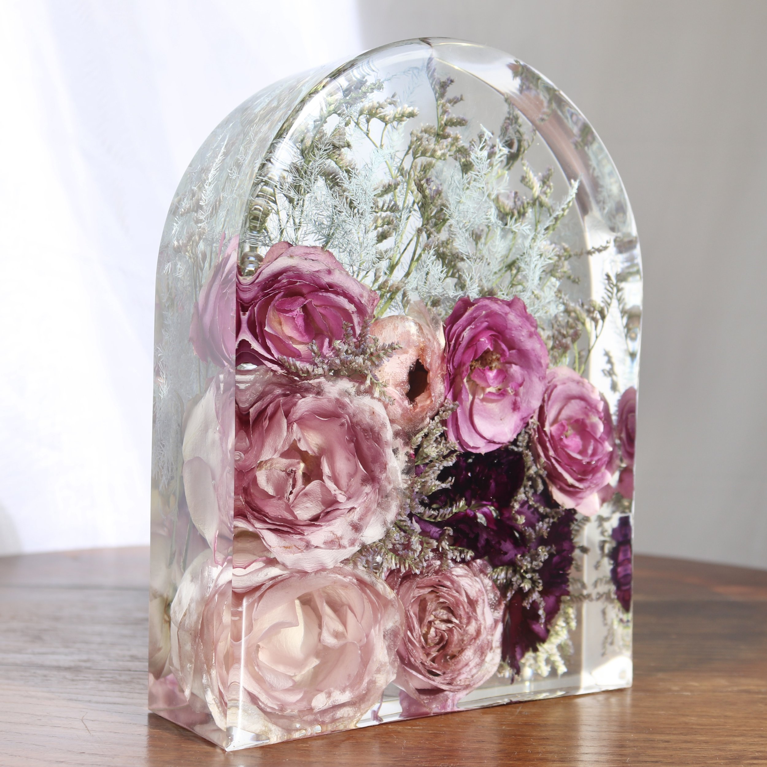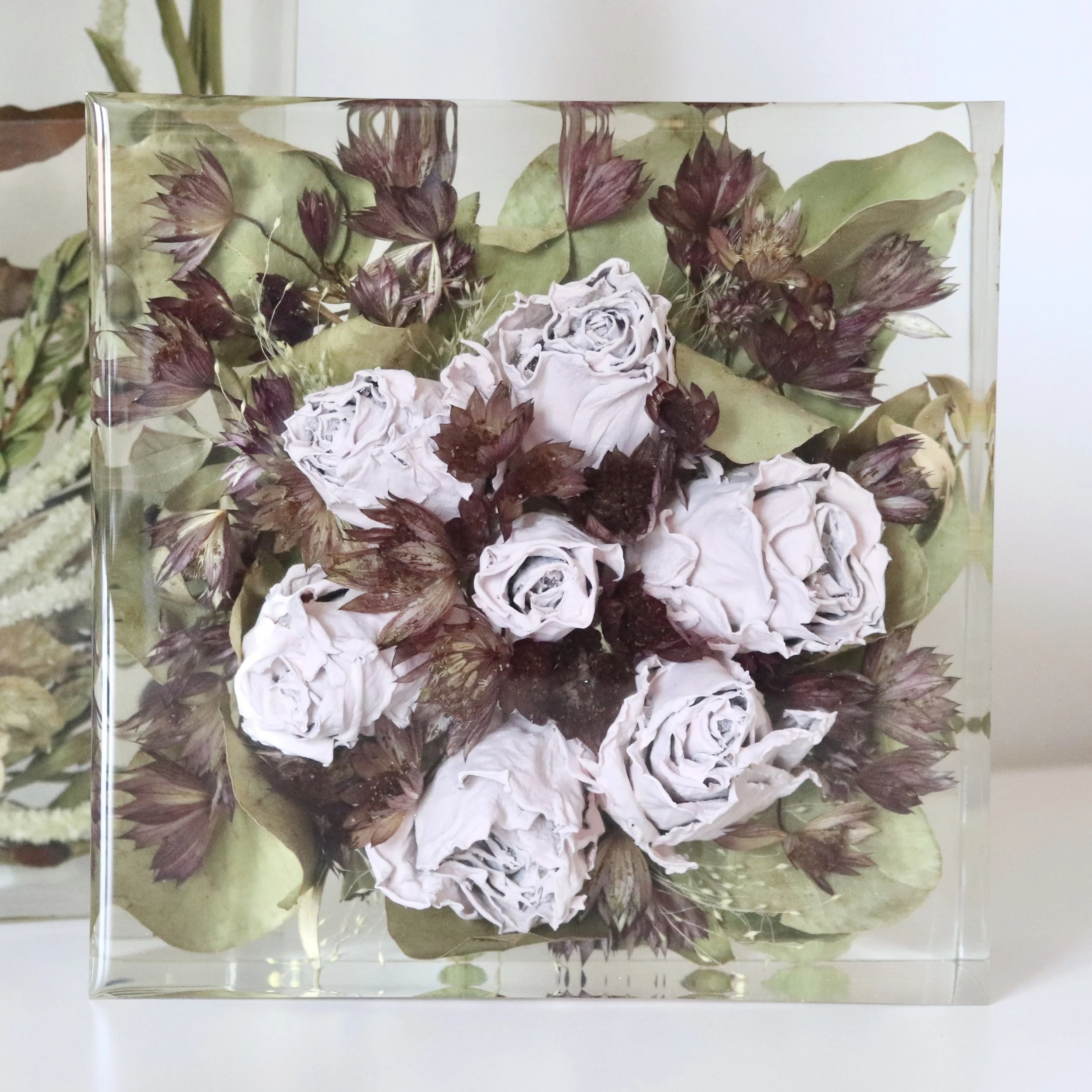 Les bouquets séchés à l'air ne peuvent être préservés que sous forme de bloc en résine ou dans un cadres profonds (bois ou acryliques) et non comme tableaux ou suspensions acryliques. En outre, pour la plupart des objets complémentaires plats (ornements, porte-bijoux, marque-pages), il peut être difficile d'ajouter des fleurs entières séchées à l'air, car il n'y a pas beaucoup de place. Selon le type de bouquet, il peut être possible d'ajouter uniquement des pétales et des feuilles ou des morceaux de pétales et de feuilles.