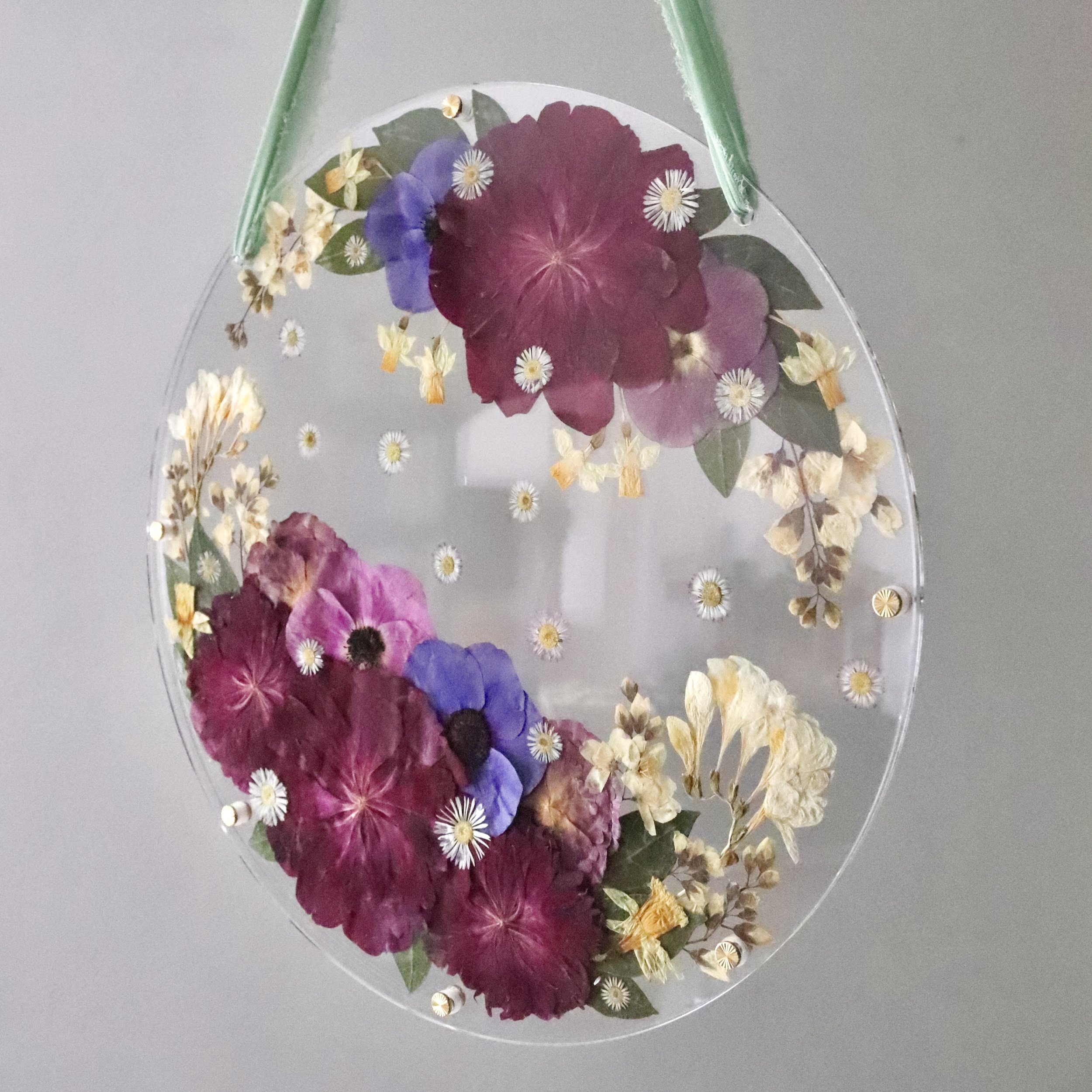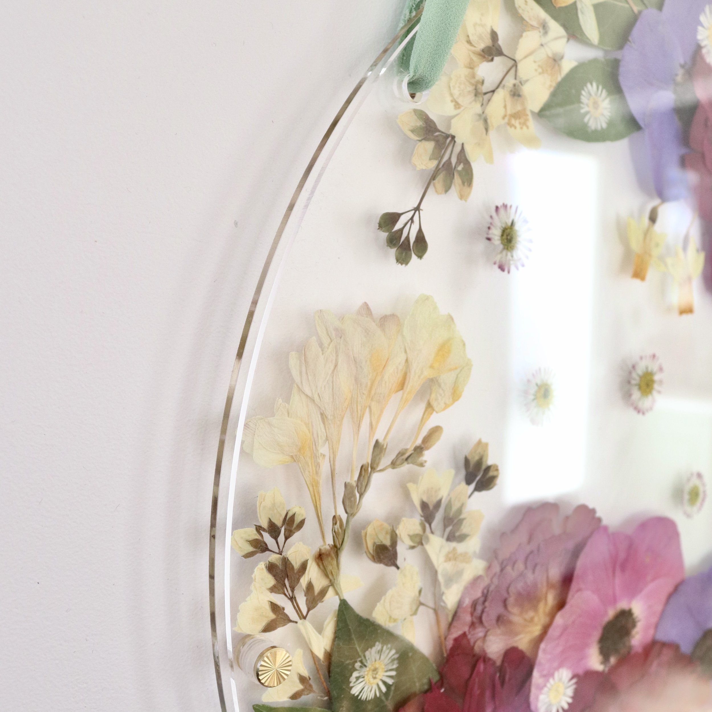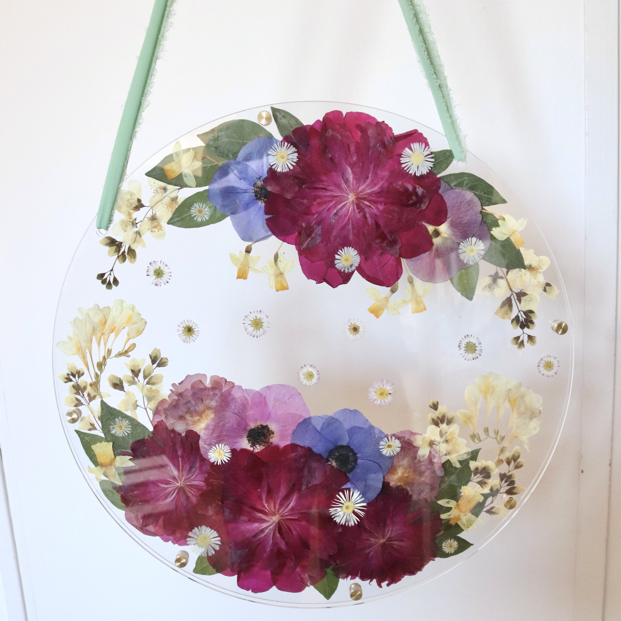 Les fleurs pressées sont collées sur une plaque ronde en verre acrylique (transparente ou au choix en différentes couleurs, tentée/ opaque/ grivée /miroirtante), une deuxième plaque transparente est placée par-dessus et fixée à l'aide de vis en laiton. Les bords restent ouverts et ne sont pas scellés. Le verre acrylique filtre naturellement les rayons UV. L'œuvre est suspendue à un ruban (si possible celui du bouquet).