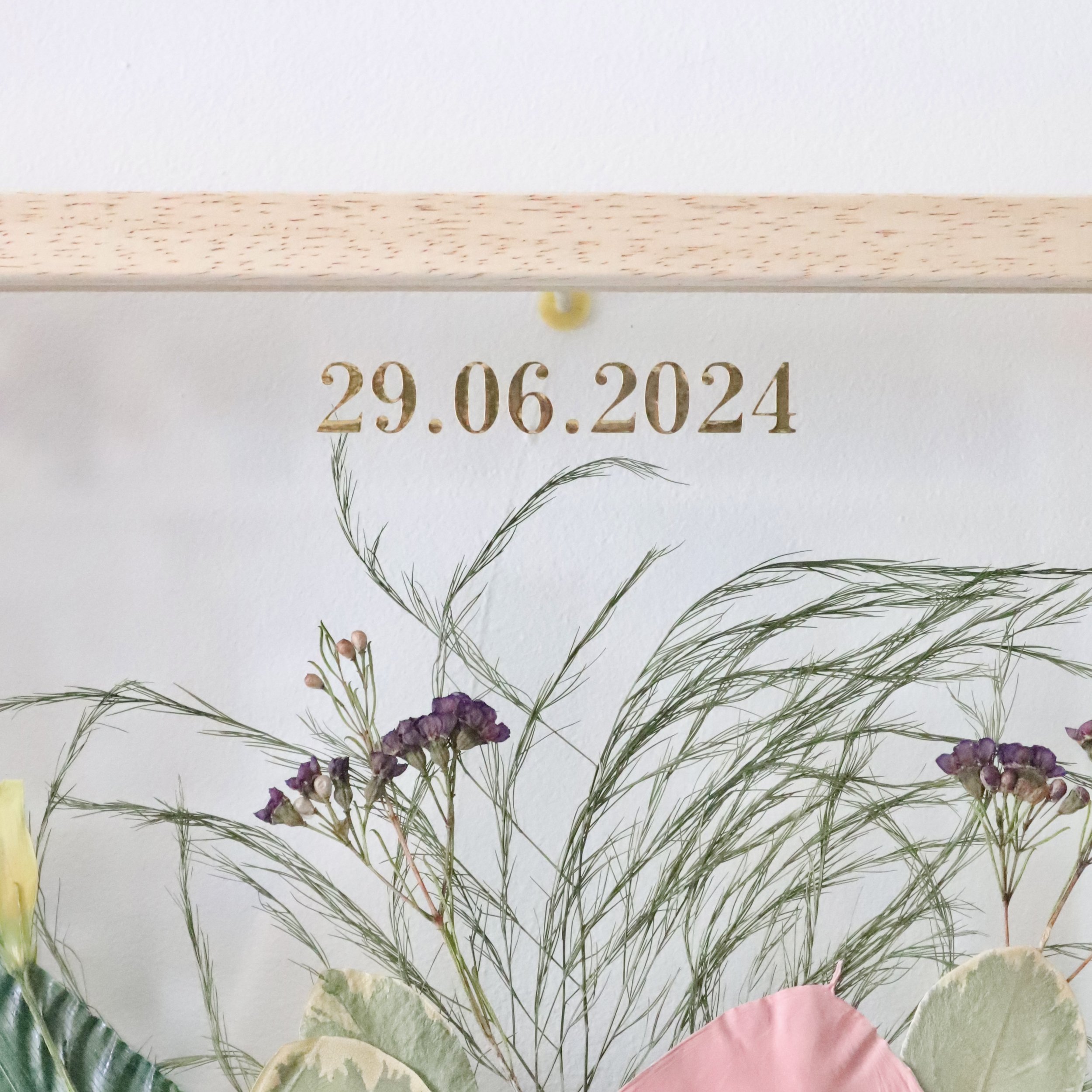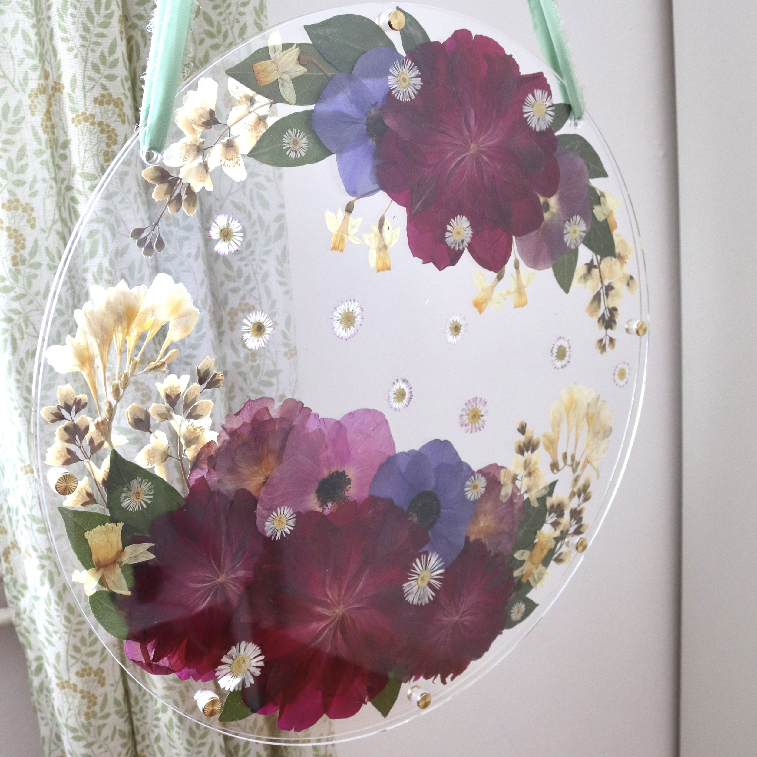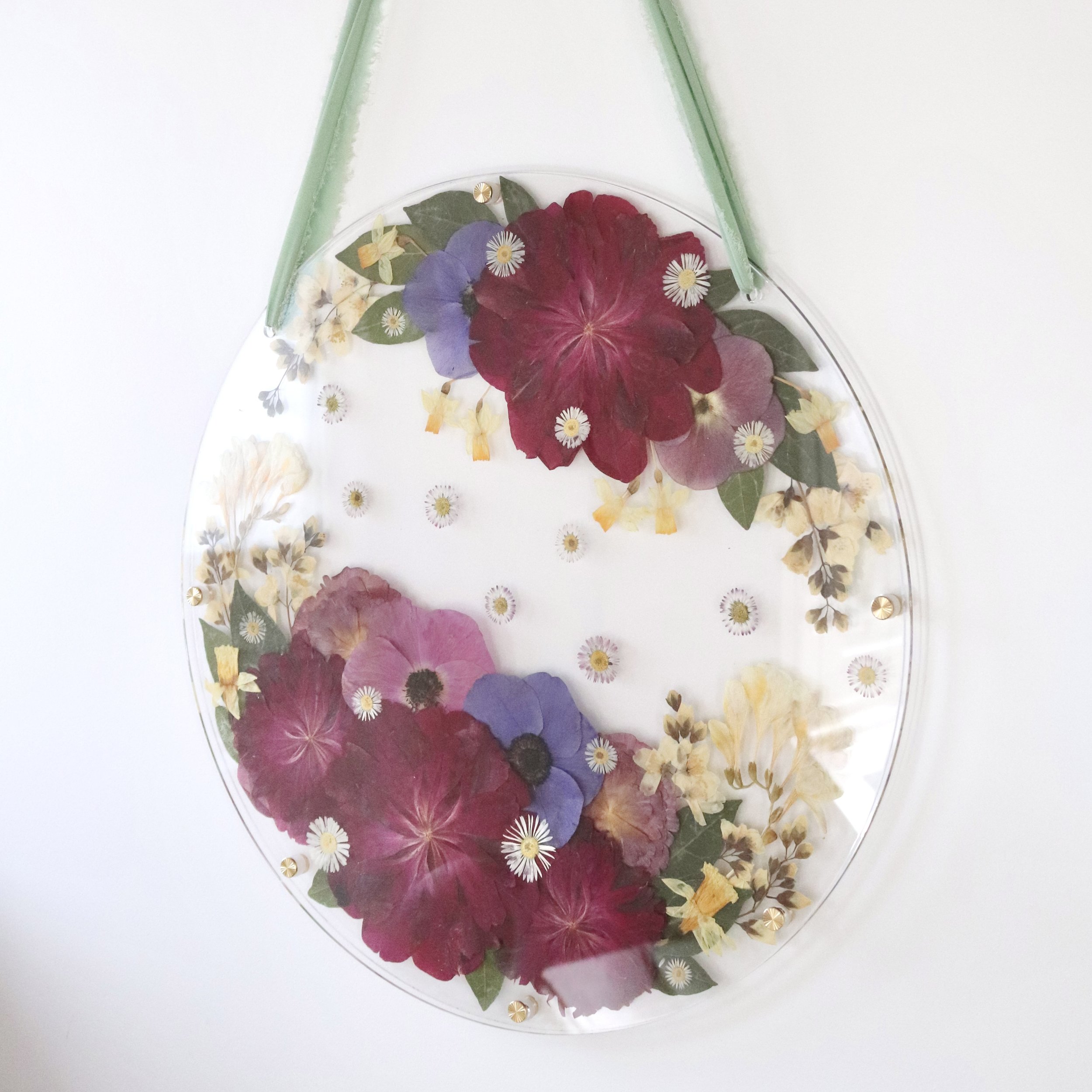 Les fleurs pressées sont collées sur une plaque ronde en verre acrylique (transparente ou au choix en différentes couleurs, tentée/ opaque/ grivée /miroirtante), une deuxième plaque transparente est placée par-dessus et fixée à l'aide de vis en laiton. Les bords restent ouverts et ne sont pas scellés. Le verre acrylique filtre naturellement les rayons UV. L'œuvre est suspendue à un ruban (si possible celui du bouquet).