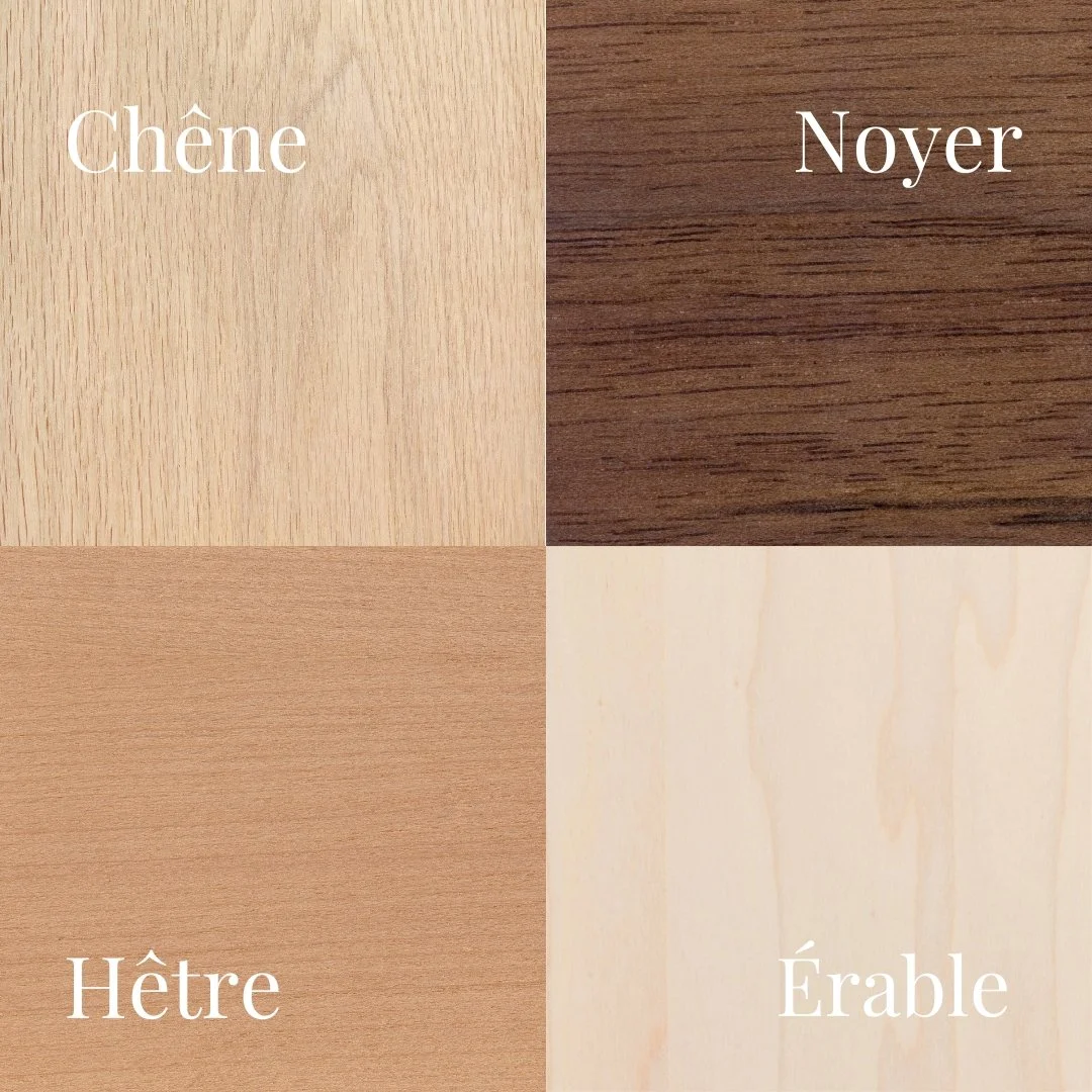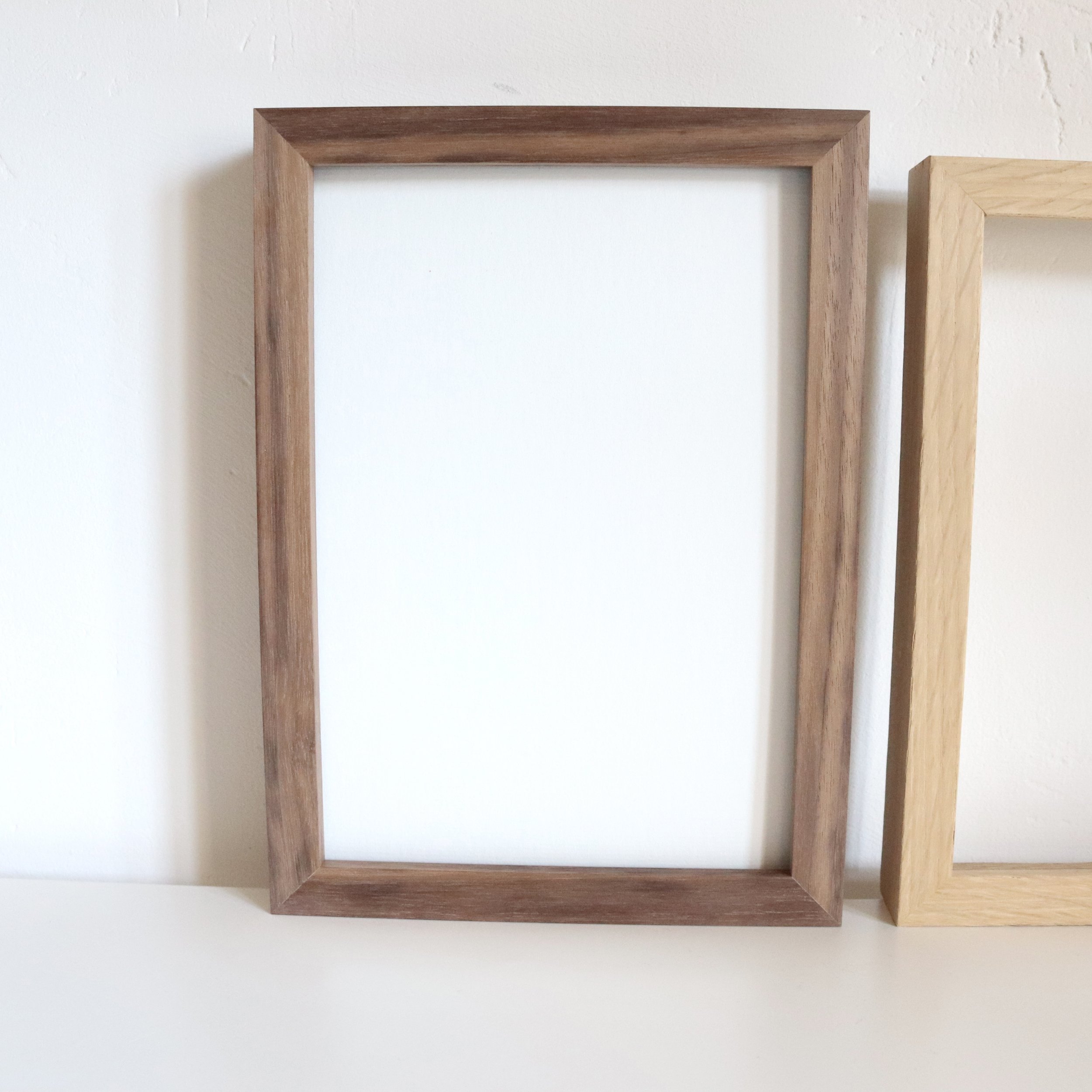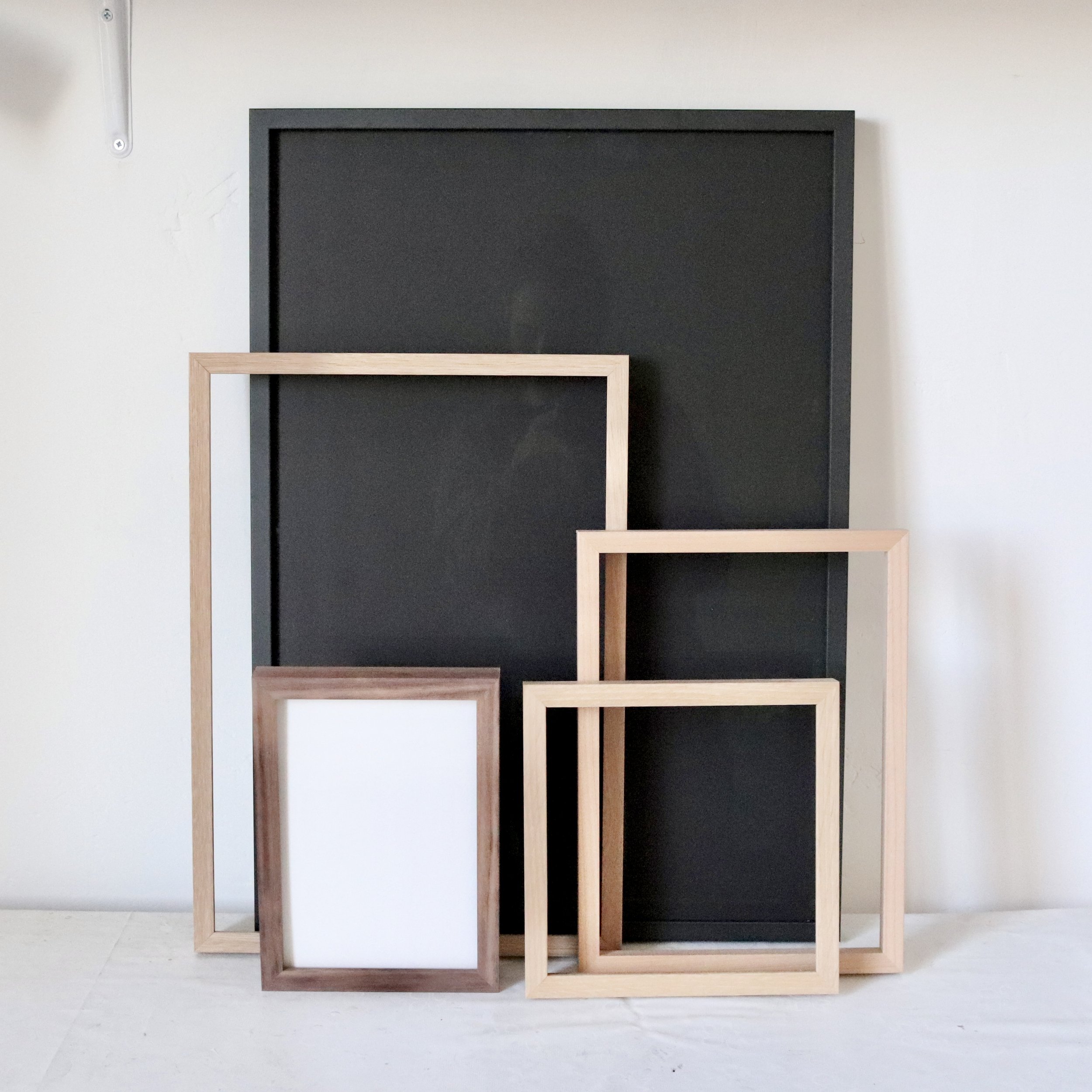 Les cadres sont disponibles en quatre options de bois massif : chêne, hêtre, érable et noyer. De plus des cadres noir et blanc sont disponibles.