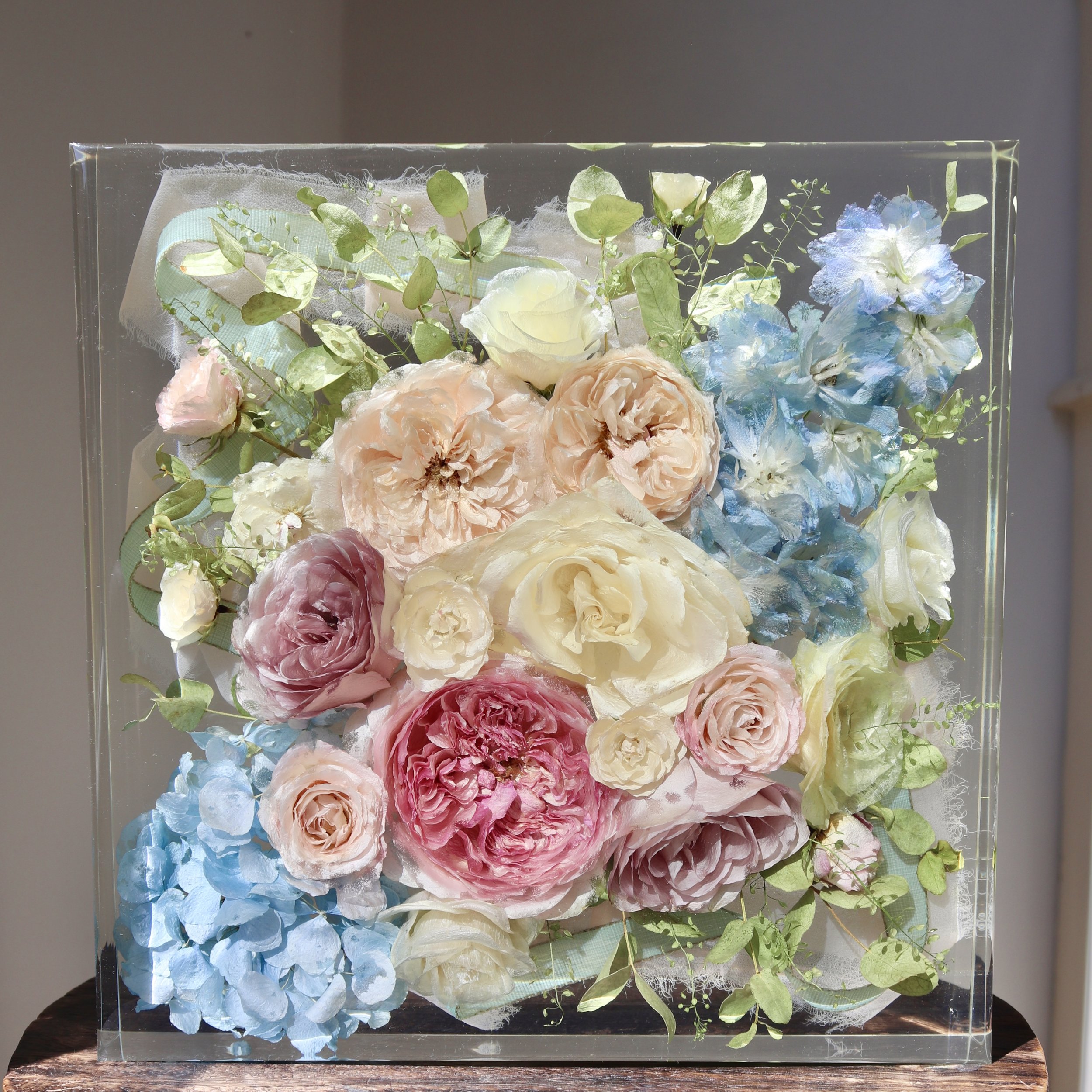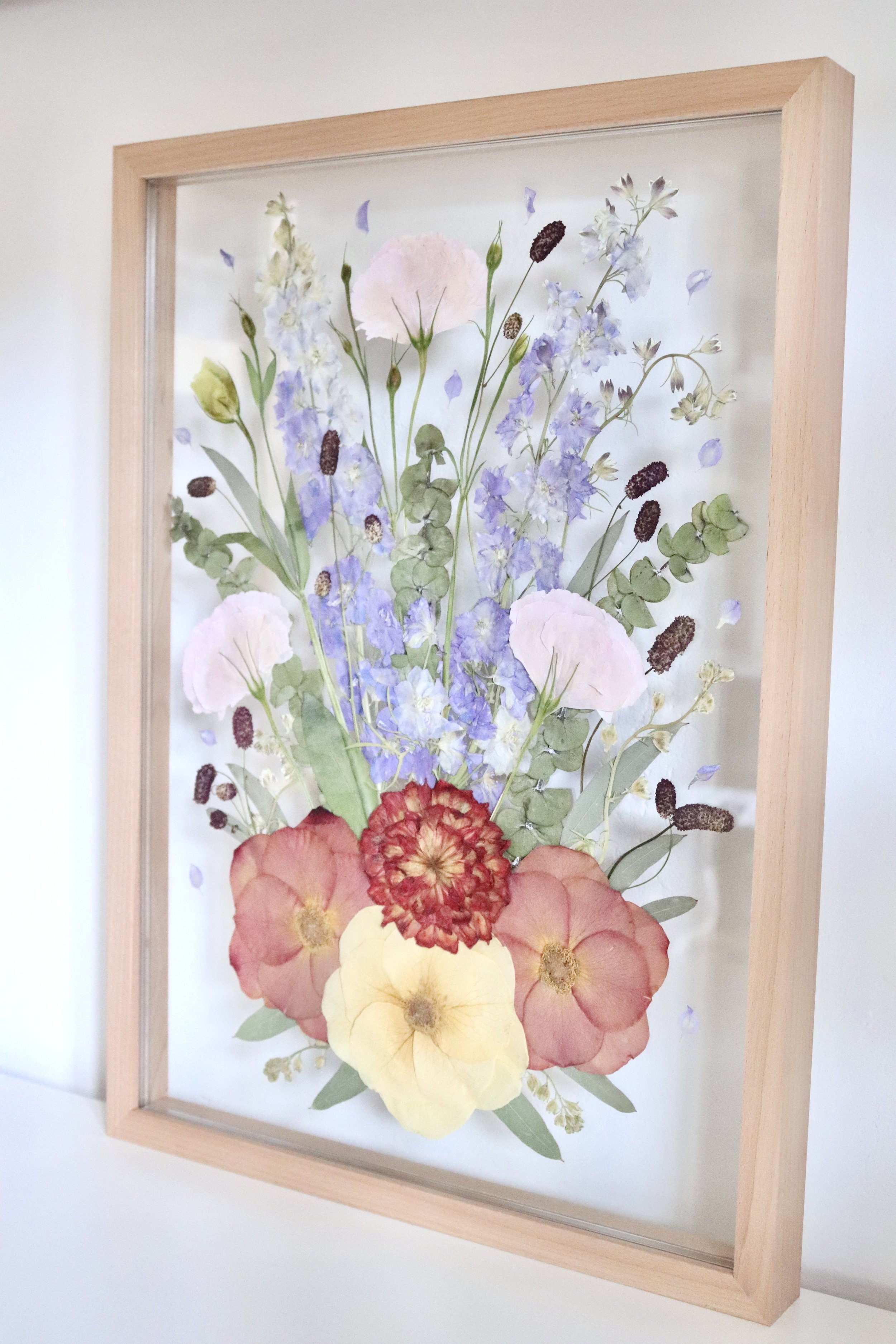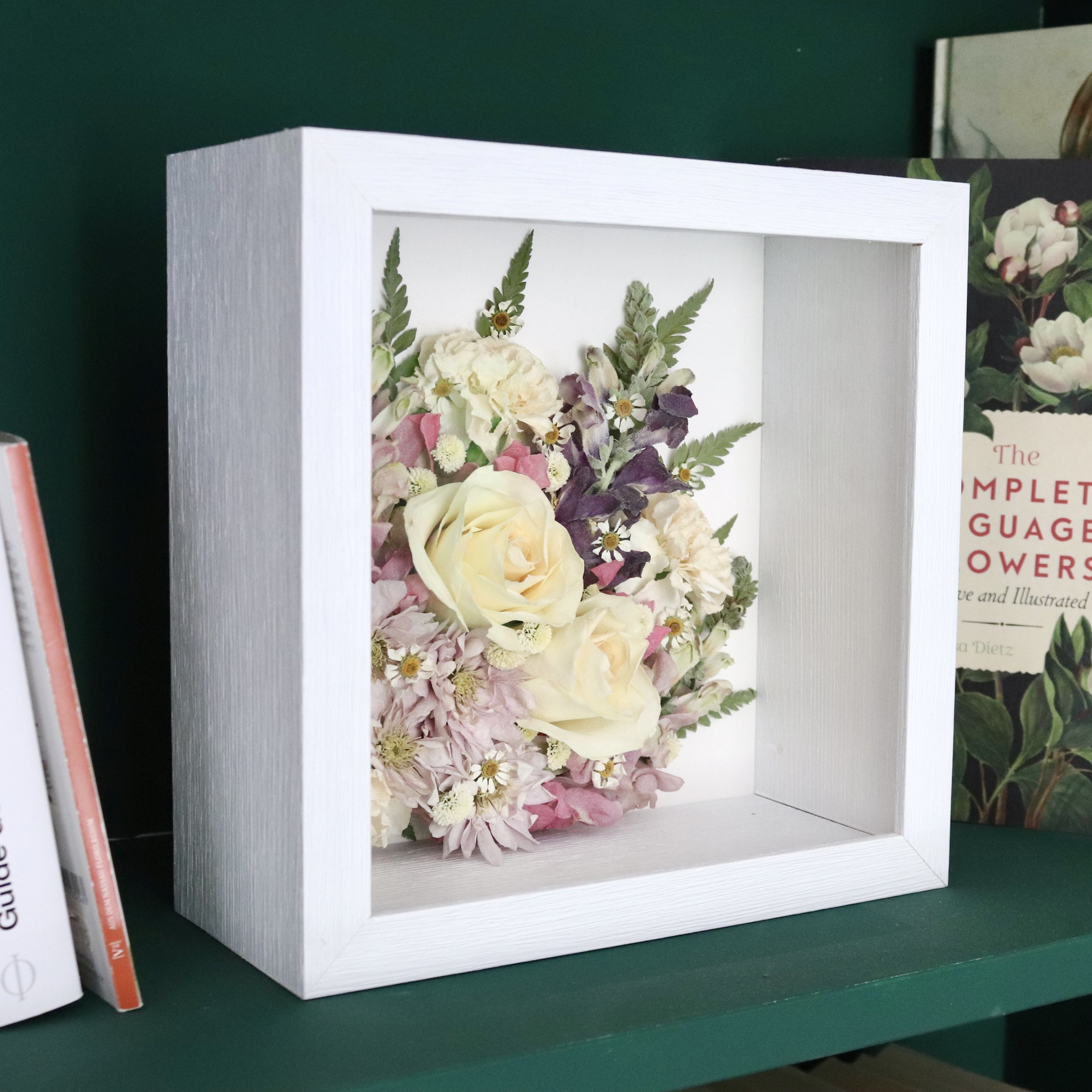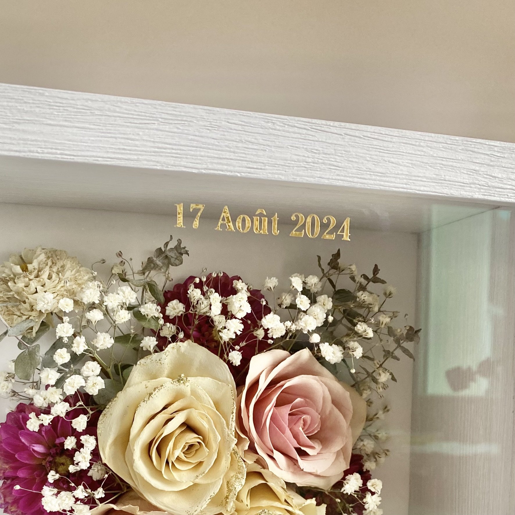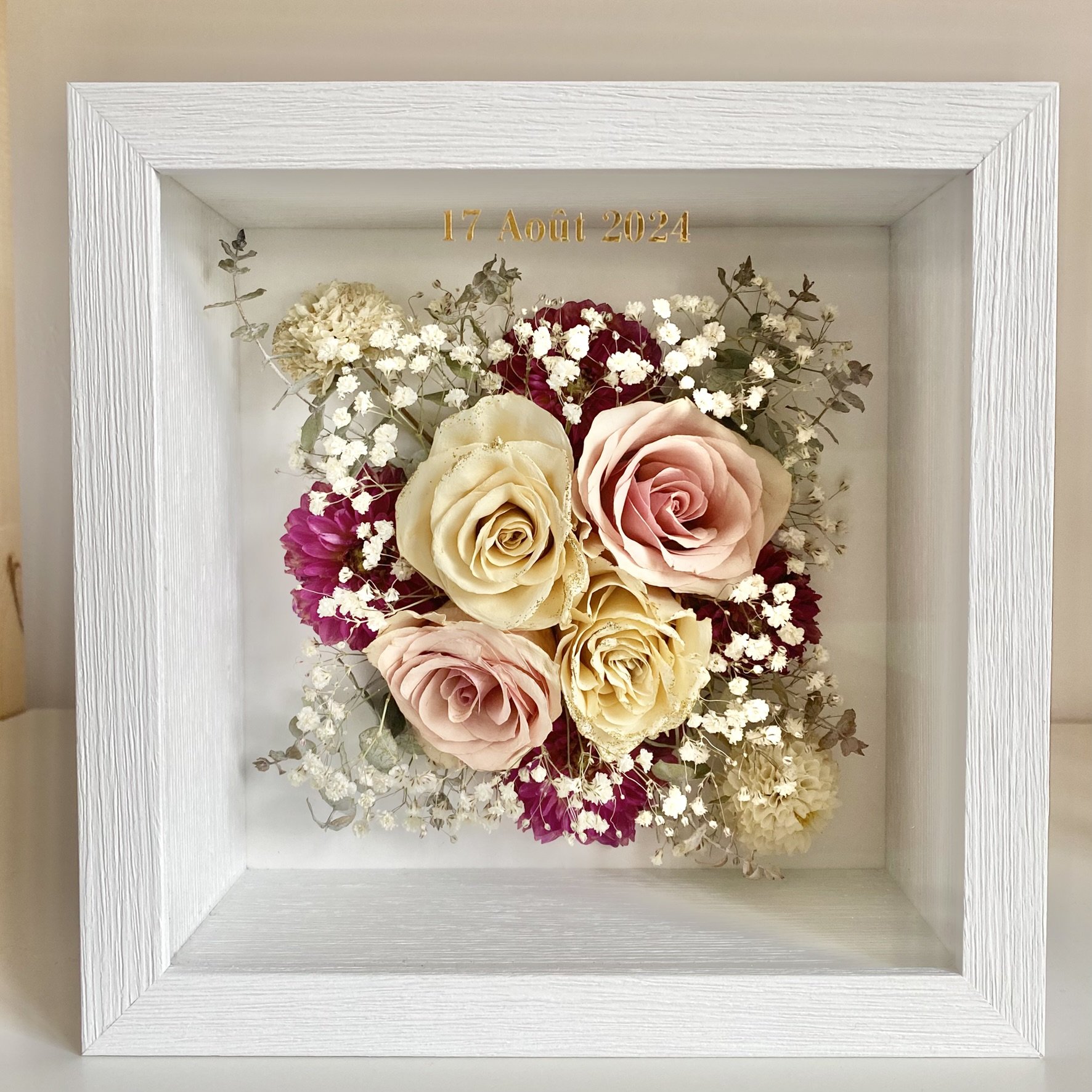 Ce cadre profond est créé en combinant la boîte en acrylique fabriquée par la société allemande krasspedia avec des cadres de style classique réalisés par mon encadreur. C'est l'alternative parfaite pour tous ceux qui souhaitent que leurs fleurs conservent leur forme 3D, mais ne veulent pas d'un bloc en résine époxy.