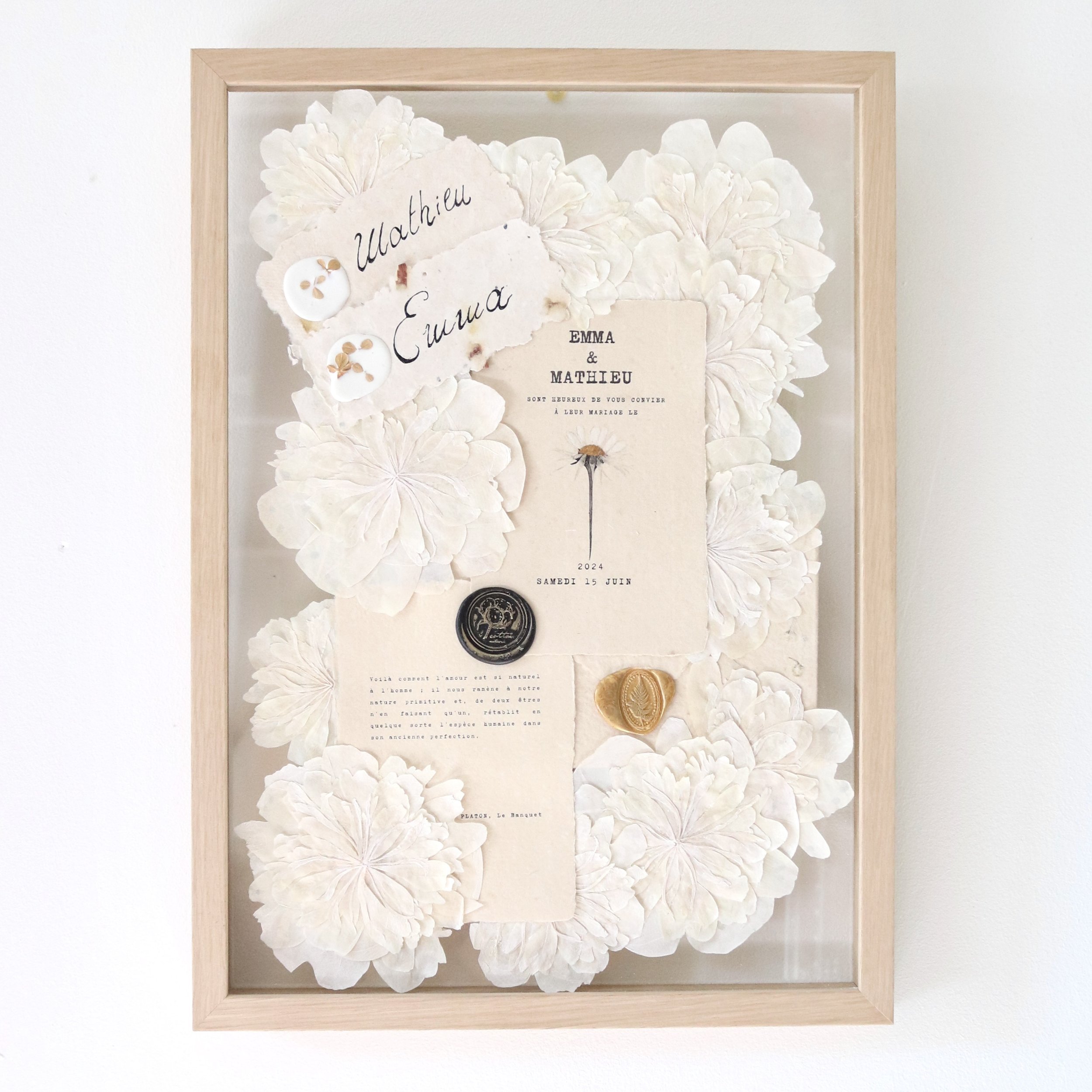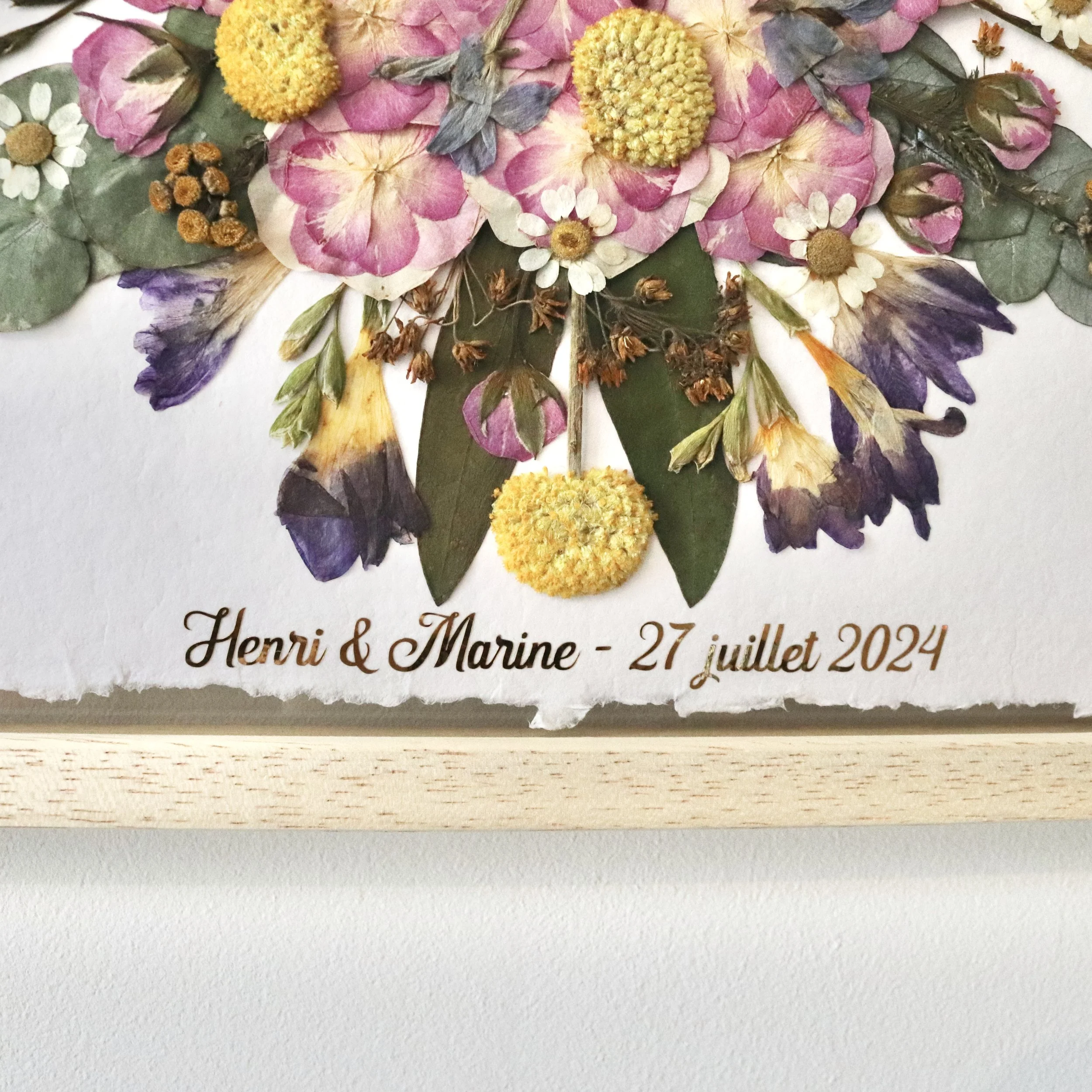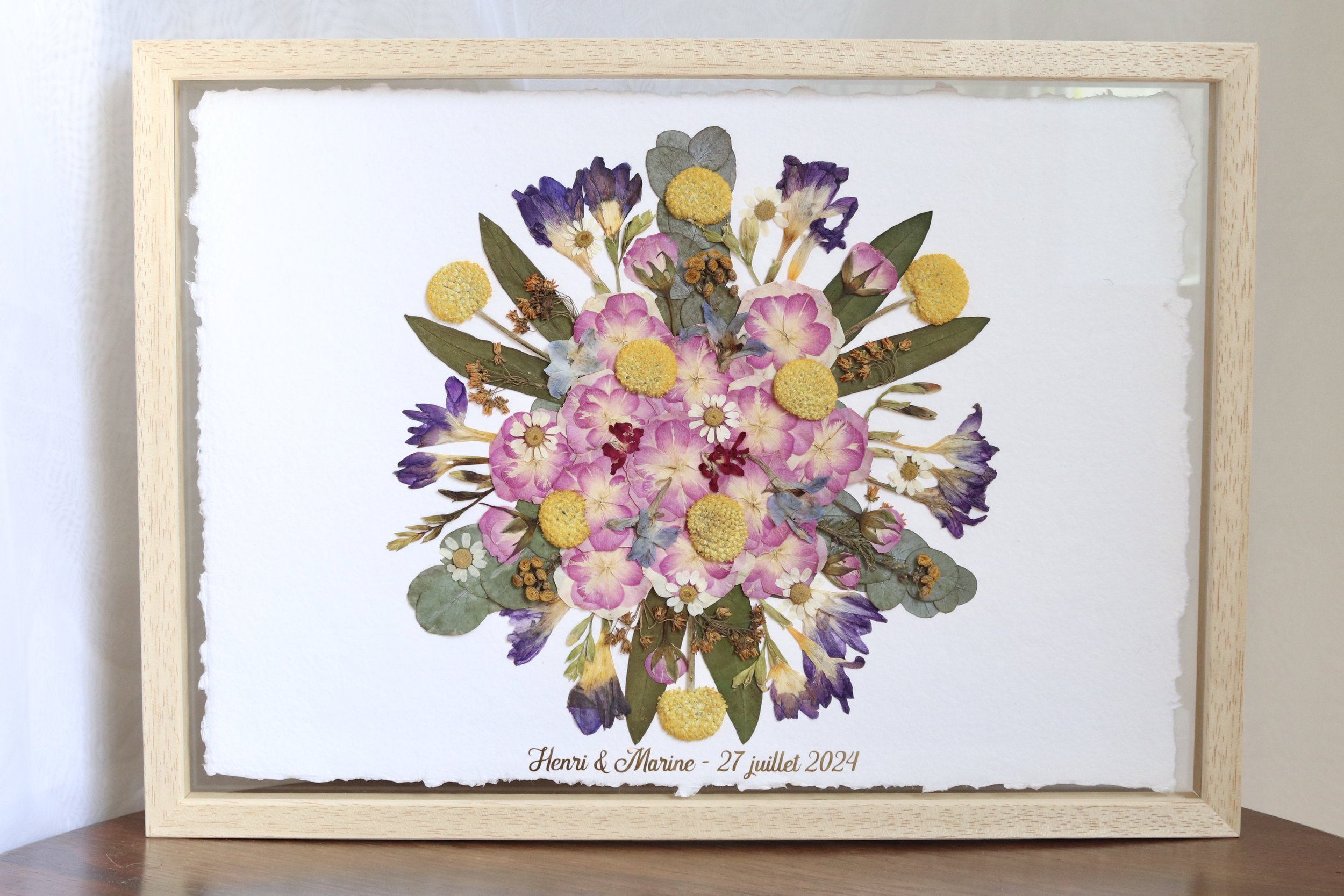- Variante du cadre flottant avec insert en papier fait main (au lieu d'être collées sur le verre inférieur, les fleurs sont collées sur un papier lourd, de haute qualité et fait main, qui est ensuite placé entre les verres) : + 20 €