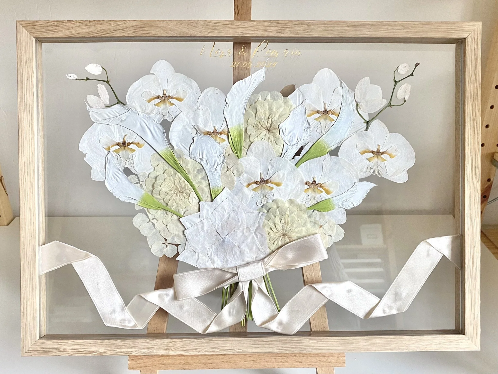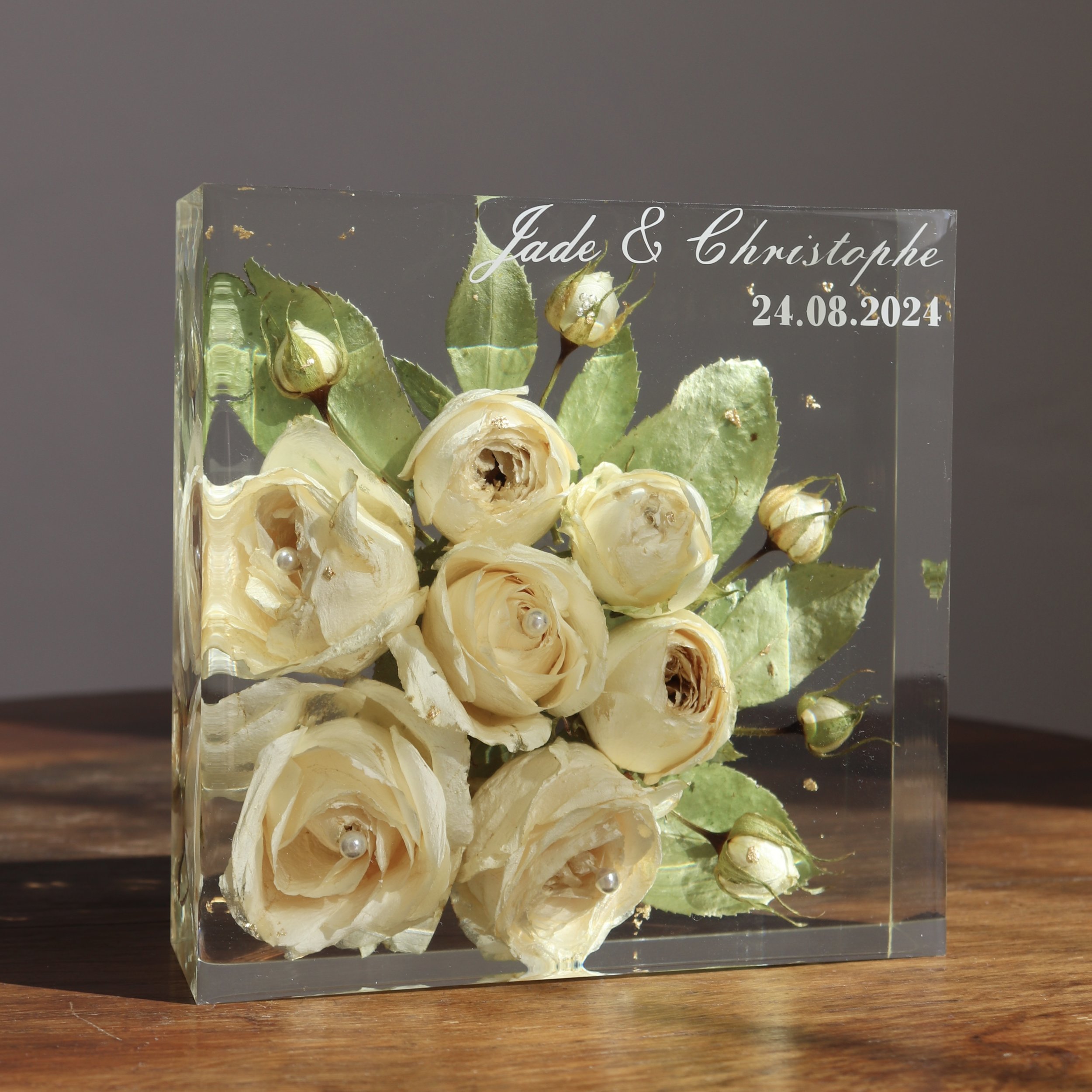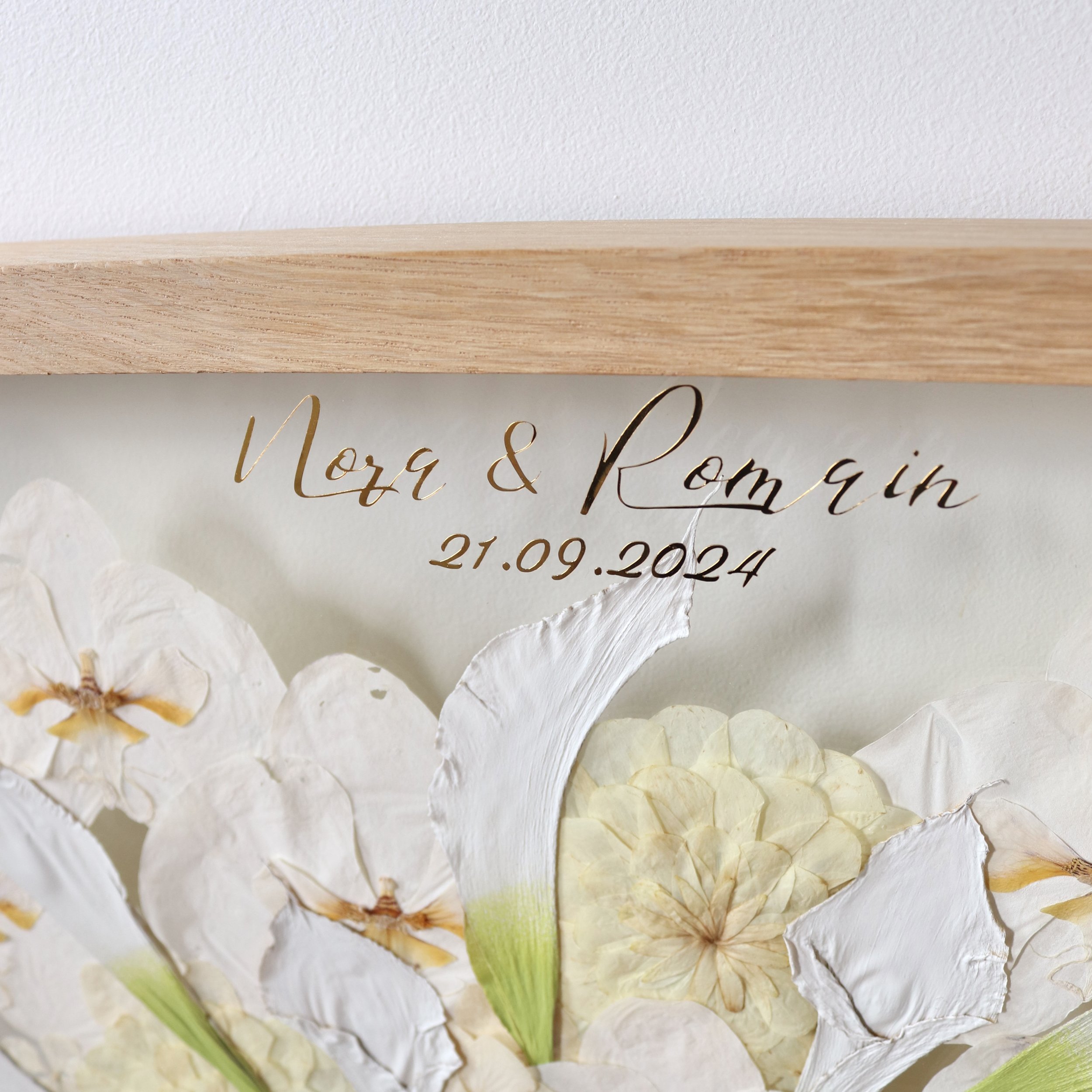 Les inscriptions sont réalisées à partir d'un vinyle adhésif permanent découpé. Cette option permet d'ajouter une touche encore plus personnelle à la préservation de votre bouquet. Les possibilités sont infinies - vous pouvez ajouter vos prénoms, vos initiales ou votre nouveau nom de famille commun ("M. et Mme ... ) en combinaison avec une date. Une option intéressante pour les cadeaux est d'ajouter des inscriptions telles que "Mère de la mariée" ou "Demoiselle de la mariée".