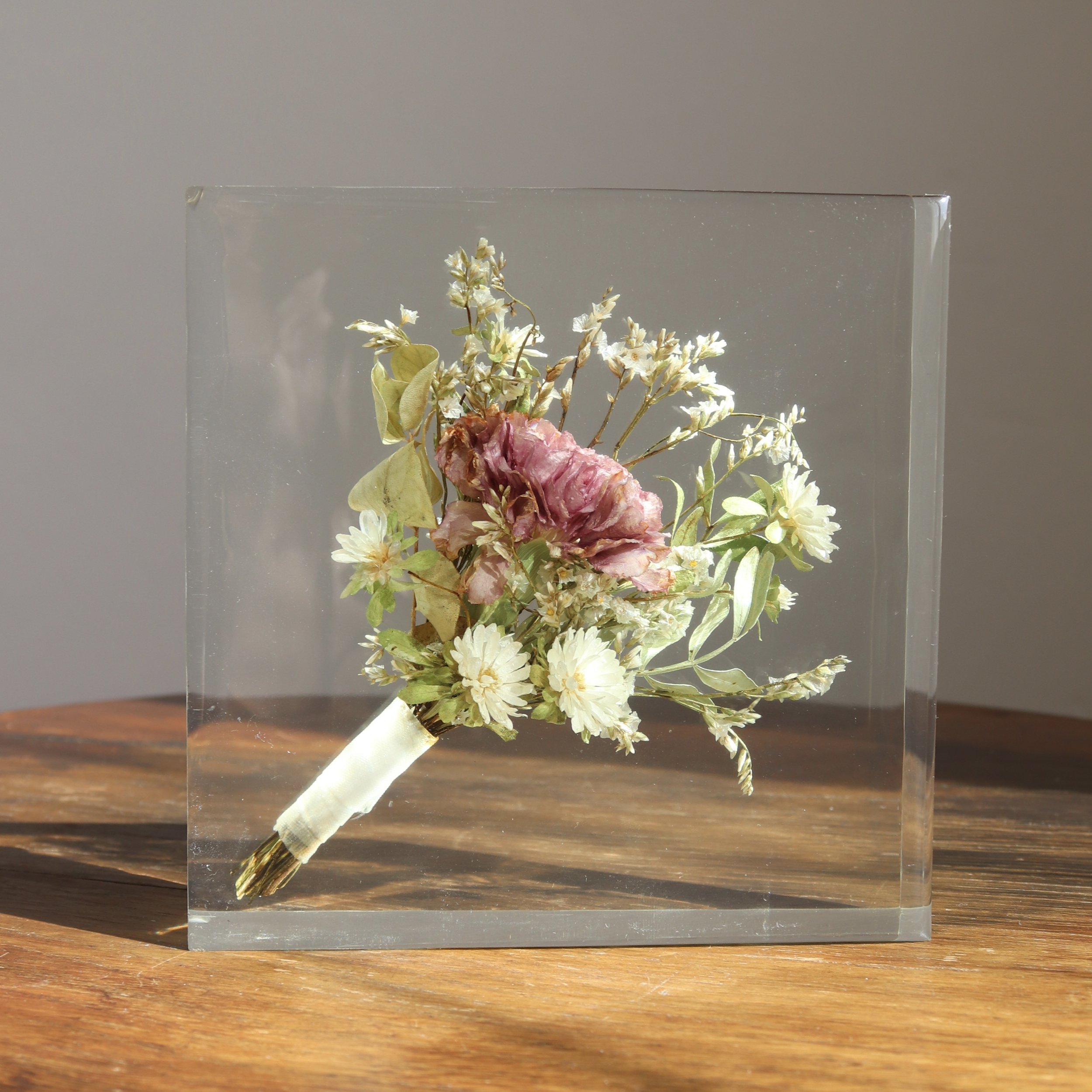 Parfait pour conserver la boutonnière ou comme cadeau idéal pour la famille ou les témoins. Si vous avez un deuxième petit bouquet (par exemple issu d'une cérémonie civile) ou si vous souhaitez ajouter une petite suspension acrylique à un bloc de résine ou tableaux, c'est l'option idéale.