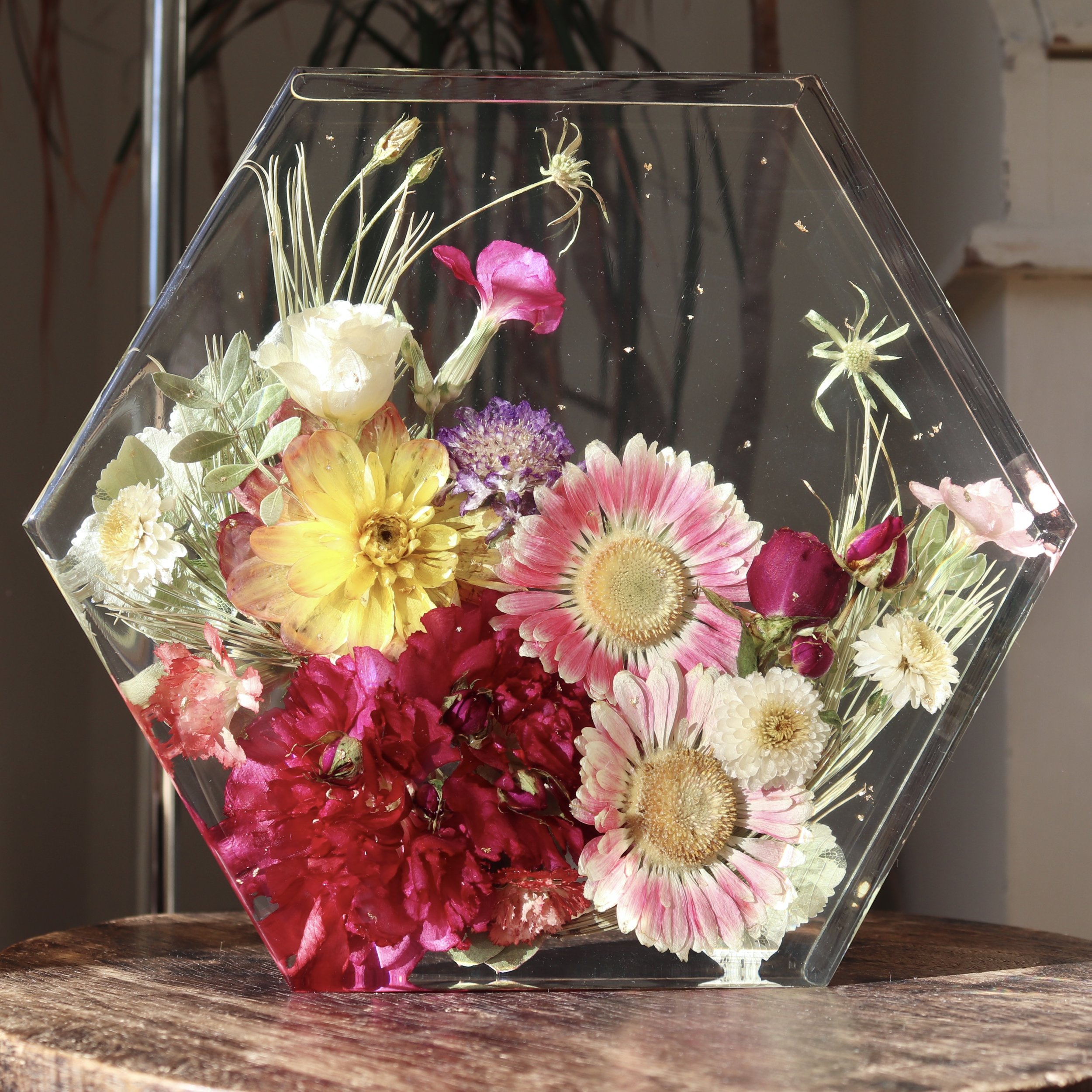 Fleurs pressées en résine epoxy.