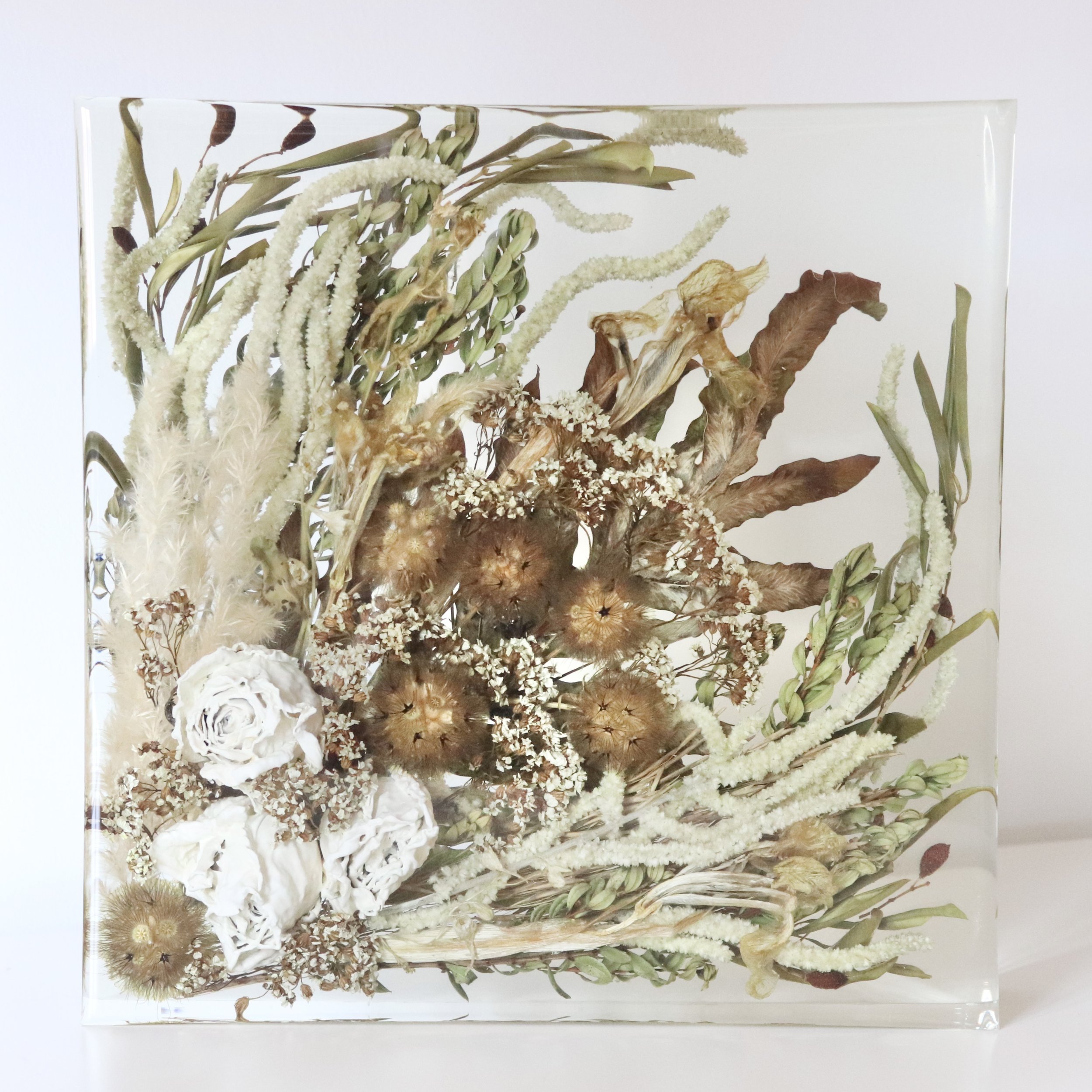 Fleurs séchées en 3D en résine époxy. Le coulage se fait à l'envers, les inclusions d'air sont donc inévitables !